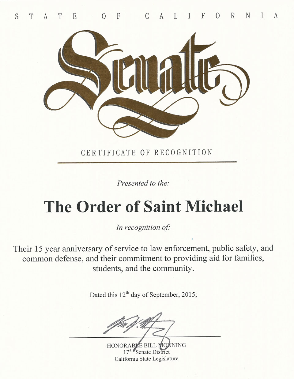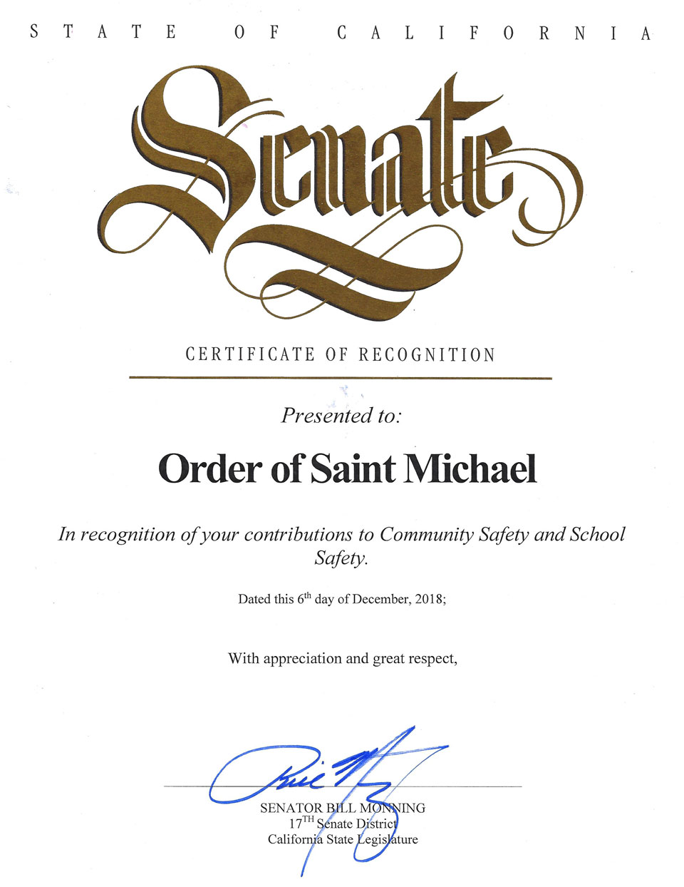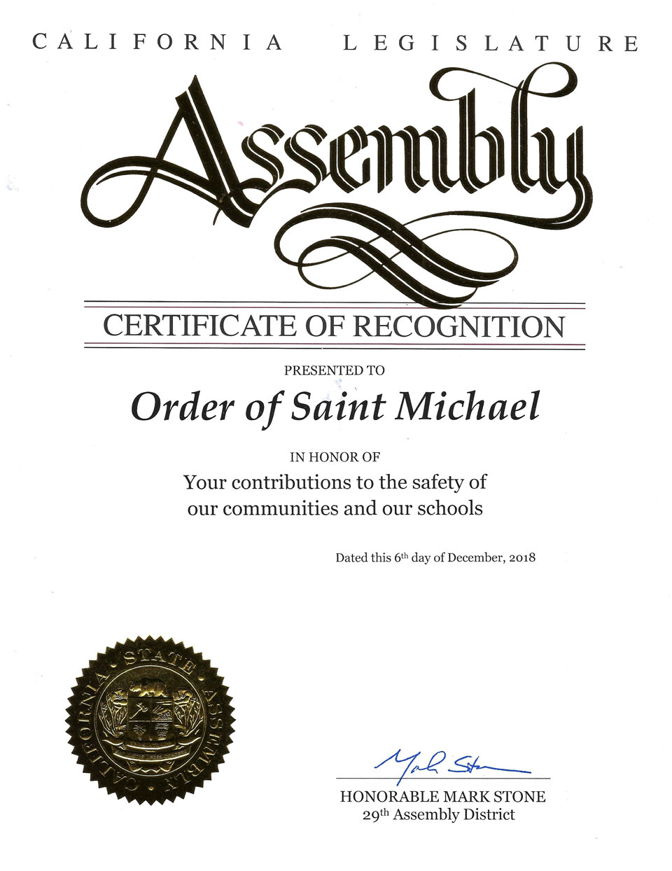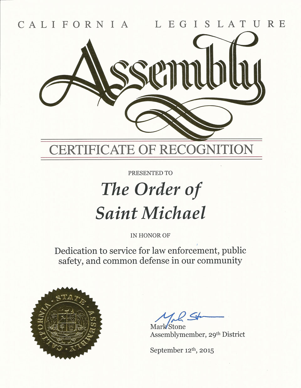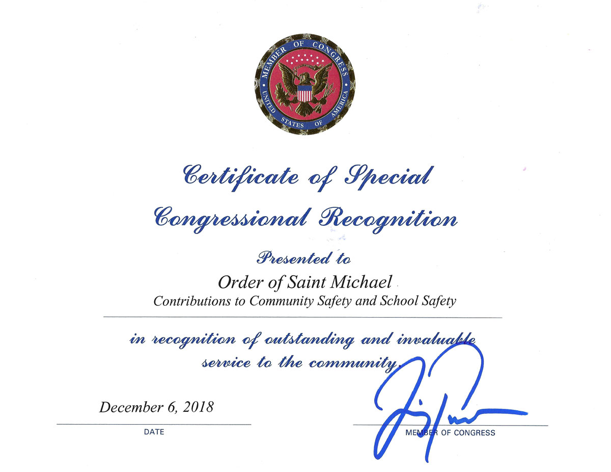 The Order of Saint Michael recognition program was developed to recognize individuals in public safety and common defense who meet the criteria to receive an award for merit, valor, or life-saving/rescue. The organization also recognizes citizens who have committed acts of valor or lifesaving that meet the criteria for the award. Businesses who meet the criteria for outstanding support to public safety and common defense are recognized with the Order of Saint Michael’s esteemed “Archangel Award.” The order of Saint Michael participates in the distribution of many of these awards in conjunction with the Monterey County Peace Officers Association, and the California State Juvenile Officers Association.