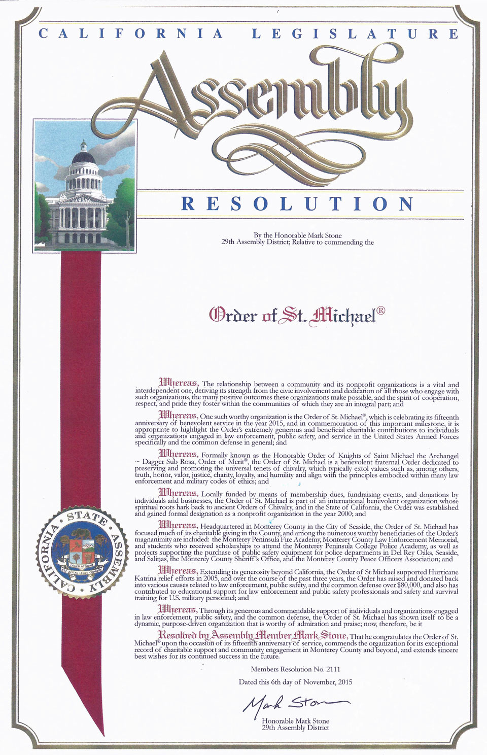 Although the Order of St. Michael the Archangel is a very ancient Order of Chivalry, the Order of Saint Michael was formerly established here in California as an official Fraternal Benevolent Non-Profit organization in the year 2000.