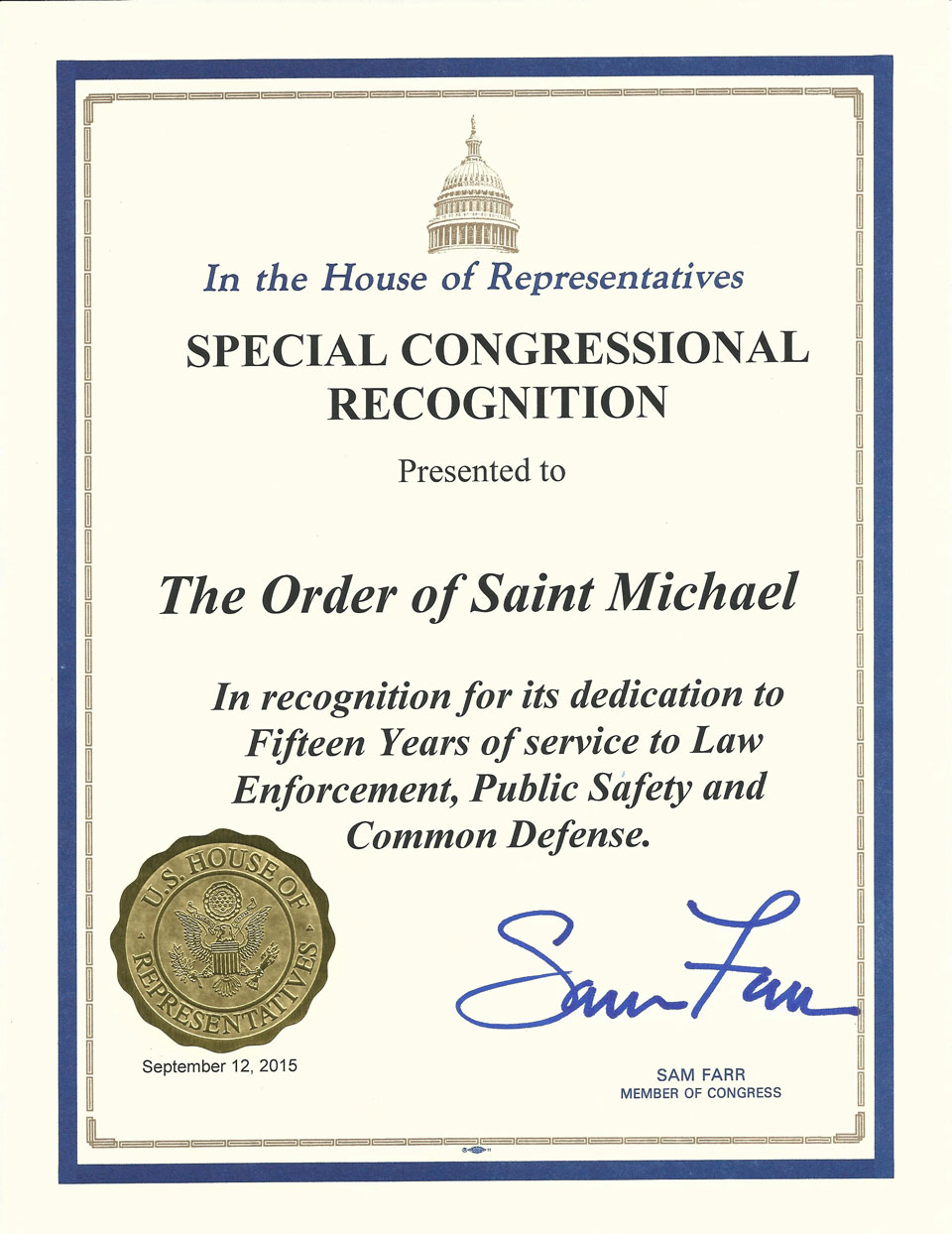Over the past few years the Order of Saint Michael along with its sister Order, the Knights of the Rose, has presented more than a dozen posthumous Medal of Valor Awards/plaques to the families of Officers killed in the line of duty and military members lost in the line of duty.